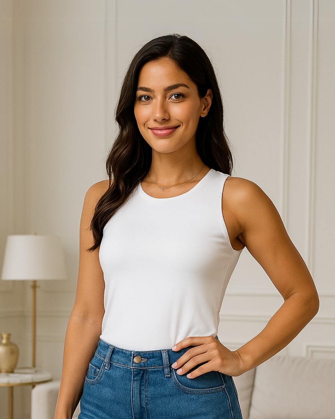 Clássica, versátil e indispensável, a regata branca sem mangas é aquela peça coringa que combina com qualquer estilo! Com modelagem justa e um decote redondo atemporal, ela valoriza a silhueta e proporciona um toque de sofisticação ao look. Feita em tecido macio e elástico, garante conforto e caimento impecável, perfeita para qualquer ocasião.